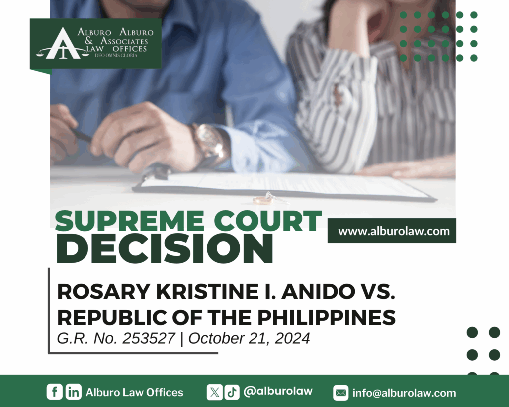 In the case of Anido v. Republic of the Philippines, G.R. No. 253527, October 21, 2024, the Supreme Court ruled that the foreign law that must be proven by a party who seeks the recognition of a divorce decree or judgment must be the law of the country or state that issued it. The applicant must prove the law of the foreign court, office, or tribunal to show that it had competence or jurisdiction to issue the foreign decree or judgment, and that the latter is valid and binding in the country or state from which it originates.